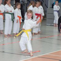 Der Großteil unserer Starter begann den Wettkampf am Pool 4 in der Kategorie K1. Die Austragungsform der Kata-Vorrunde war ein direktes Ausscheidungsverfahren. Bei gefühlten 20 Startern auch nicht anders machbar. Im direkten Vergleich waren Kampfrichterentscheidung (Hauptkampfrichter + 4 Eckkampfrichter) sicher noch nachzuvollziehen, in der Punkterunde (die besten 8) jedoch nicht mehr. Welche Bewertungskriterien bei den 8-11jährigen bis Orangegurt wirklich zählten – ein Rätsel. An der Stelle kamen wir nicht weiter und schieden vor den Podestplätzen aus. Anschließend fand sofort Kumite für diese Gruppe statt. Sanbon-Kumite, welches paarweise vorgetragen wird, wird anschließend als „Gesamtpaket“ bewertet. Es wurde im Vorfeld explizit darauf hingewiesen, dass ein separater Morote Gedan Barai vor dem Mae Geri zu einem Punktabzug führt. Wozu genau dieser Hinweis kam, völlig unklar. Da wir Sanbon-Kumite jedoch genau so trainieren, wiesen wir den Hauptkampfrichter darauf hin, was mit dem Kommentar „wir machen das immer so“ zur Kenntnis genommen wurde. Nebenbei – an anderen Pools spielte das keine Rolle. Unsere 6 Starter gaben sich große Mühe, mit der Situation zurecht zu kommen und lieferten wirklich gute Leistungen ab. Leider schafften es nur Elena und Felicitas, einen Podestplatz zu erreichen.