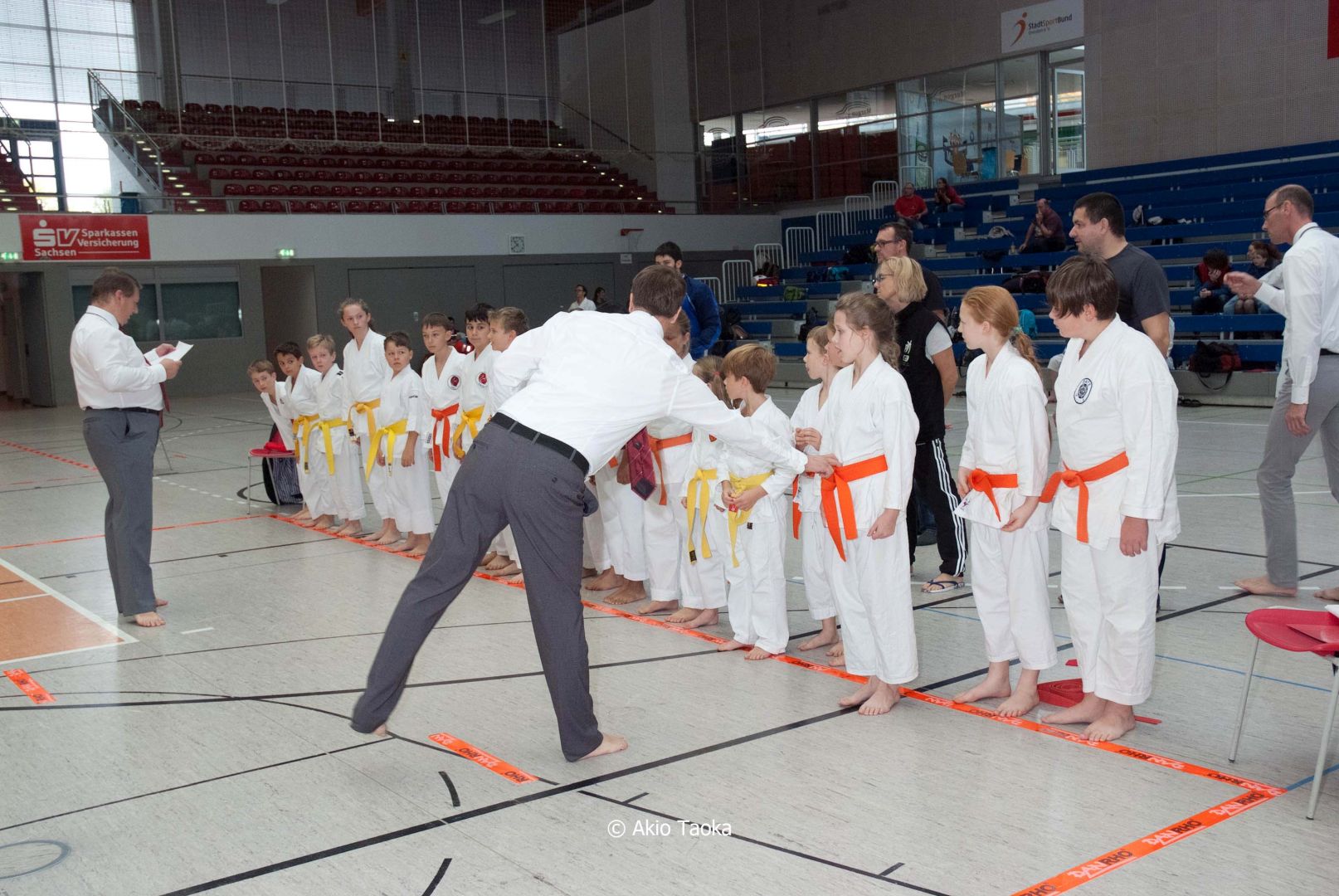 Der Großteil unserer Starter begann den Wettkampf am Pool 4 in der Kategorie K1. Die Austragungsform der Kata-Vorrunde war ein direktes Ausscheidungsverfahren. Bei gefühlten 20 Startern auch nicht anders machbar. Im direkten Vergleich waren Kampfrichterentscheidung (Hauptkampfrichter + 4 Eckkampfrichter) sicher noch nachzuvollziehen, in der Punkterunde (die besten 8) jedoch nicht mehr. Welche Bewertungskriterien bei den 8-11jährigen bis Orangegurt wirklich zählten – ein Rätsel. An der Stelle kamen wir nicht weiter und schieden vor den Podestplätzen aus. Anschließend fand sofort Kumite für diese Gruppe statt. Sanbon-Kumite, welches paarweise vorgetragen wird, wird anschließend als „Gesamtpaket“ bewertet. Es wurde im Vorfeld explizit darauf hingewiesen, dass ein separater Morote Gedan Barai vor dem Mae Geri zu einem Punktabzug führt. Wozu genau dieser Hinweis kam, völlig unklar. Da wir Sanbon-Kumite jedoch genau so trainieren, wiesen wir den Hauptkampfrichter darauf hin, was mit dem Kommentar „wir machen das immer so“ zur Kenntnis genommen wurde. Nebenbei – an anderen Pools spielte das keine Rolle. Unsere 6 Starter gaben sich große Mühe, mit der Situation zurecht zu kommen und lieferten wirklich gute Leistungen ab. Leider schafften es nur Elena und Felicitas, einen Podestplatz zu erreichen.